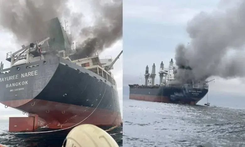 Crew were evacuated from a Thai-flagged bulk freighter after an explosion caused a fire. A Japan-flagged container ship and a Marshall Islands-flagged bulk carrier also sustained damage.
