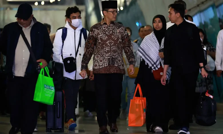 Foreign minister Sugiono (centre) walks with Indonesian nationals repatriated from Iran during their arrival at Soekarno-Hatta International Airport. (EPA Images…