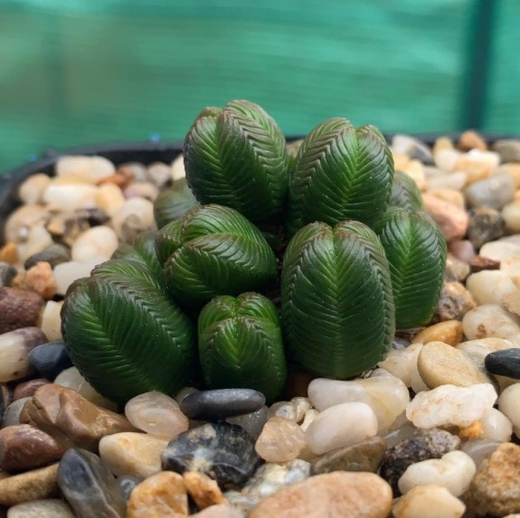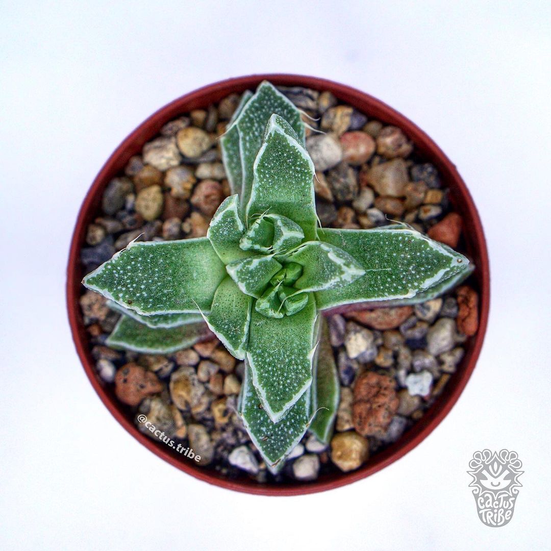 A cross-shaped faucaria with a white leaf edge. True, it says it’s a hybrid.