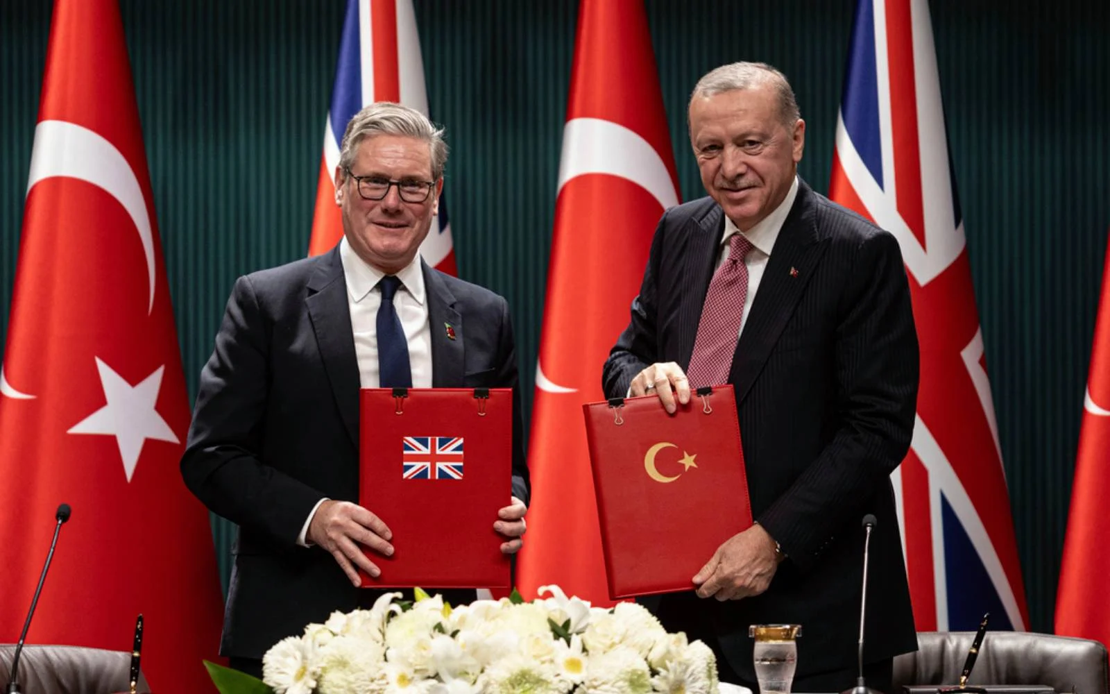 Turkish president Recep Tayyip Erdogan and UK Prime Minister Keir Starmer exchange documents after signing a bilateral agreement in Ankara. (AP pic)