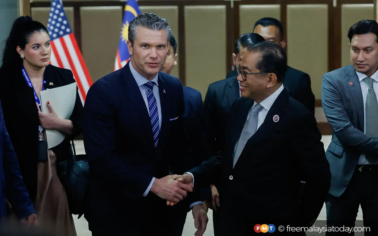 US secretary of defense Pete Hegseth shakes hands with defence minister Khaled Nordin on the sidelines of the Asean defence ministers’ meeting in Kuala Lumpur.