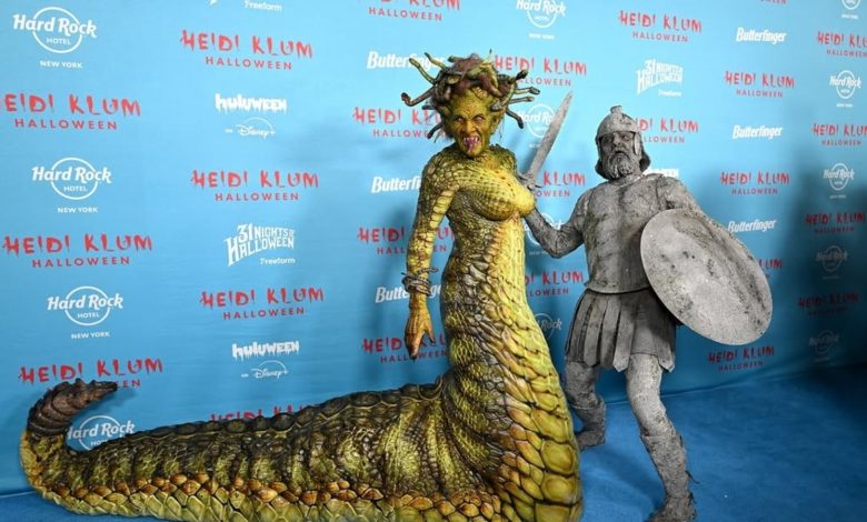 Klum did not just dress up. She started teasing glimpses of her costume earlier in the week, posting cryptic photos and behind-the-scenes clips on Instagram. “HAPPY HEIDIWEEN Don’t stare too long or you’ll turn to stone,” she wrote in one reel, showing off the final result.