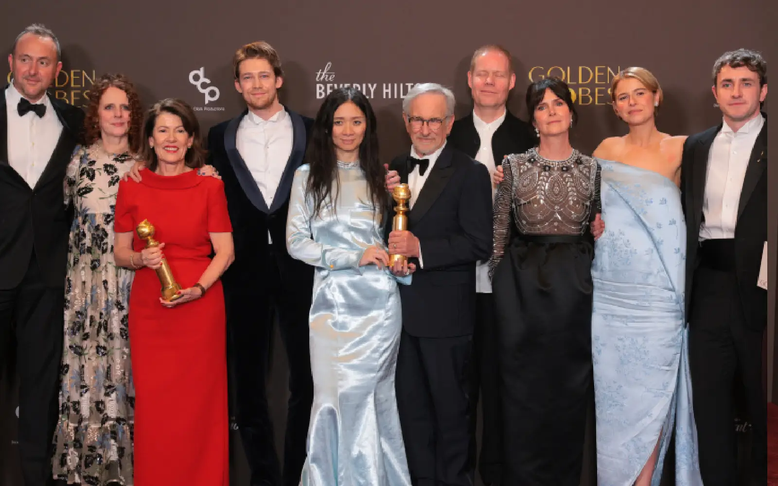 Nicolas Gonda (left), Maggie O’Farrell, Pippa Harris, Joe Alwyn, Chloe Zhao, Steven Spielberg, Max Richter, Liza Marshall, Jessie Buckley and Paul Mescal, winners of the Best Motion Picture – Drama Award for “Hamnet”. (AFP pic)