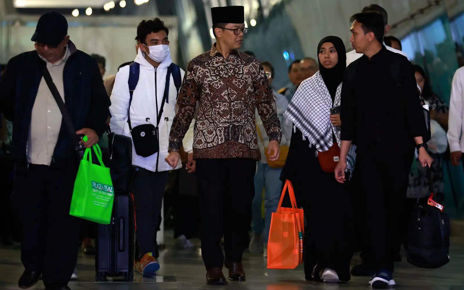 Foreign minister Sugiono (centre) walks with Indonesian nationals repatriated from Iran during their arrival at Soekarno-Hatta International Airport. (EPA Images pic)
